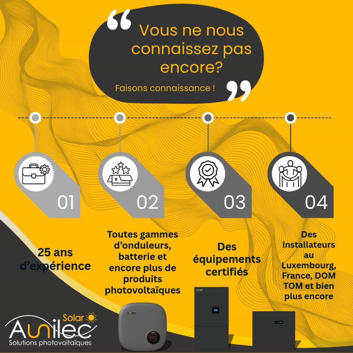 Gegründet im Jahr 2001 in Luxemburg, ist Aunilec Solar S.A. spezialisiert auf die Entwicklung, Herstellung und den Vertrieb innovativer Photovoltaiklösungen. Als Tochtergesellschaft der Aunilec Gruppe mit Sitz in Guénange (Frankreich) stützt sich das Unternehmen auf über 25 Jahre Erfahrung im Bereich der Energieumwandlung, um leistungsstarke und angepasste Ausrüstungen für jedes Projekt anzubieten, vom Privathaushalt bis zum Großindustriekunden.