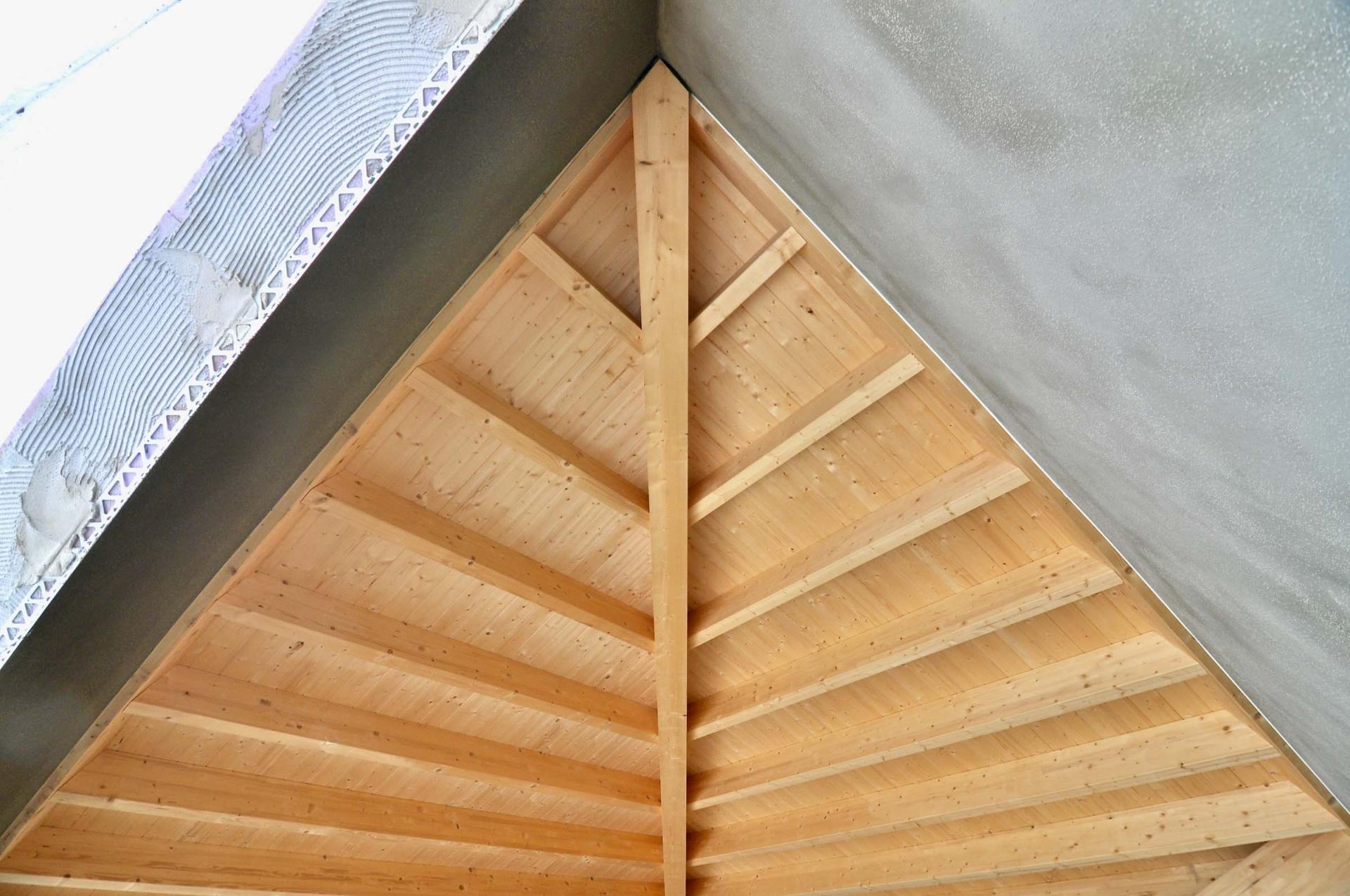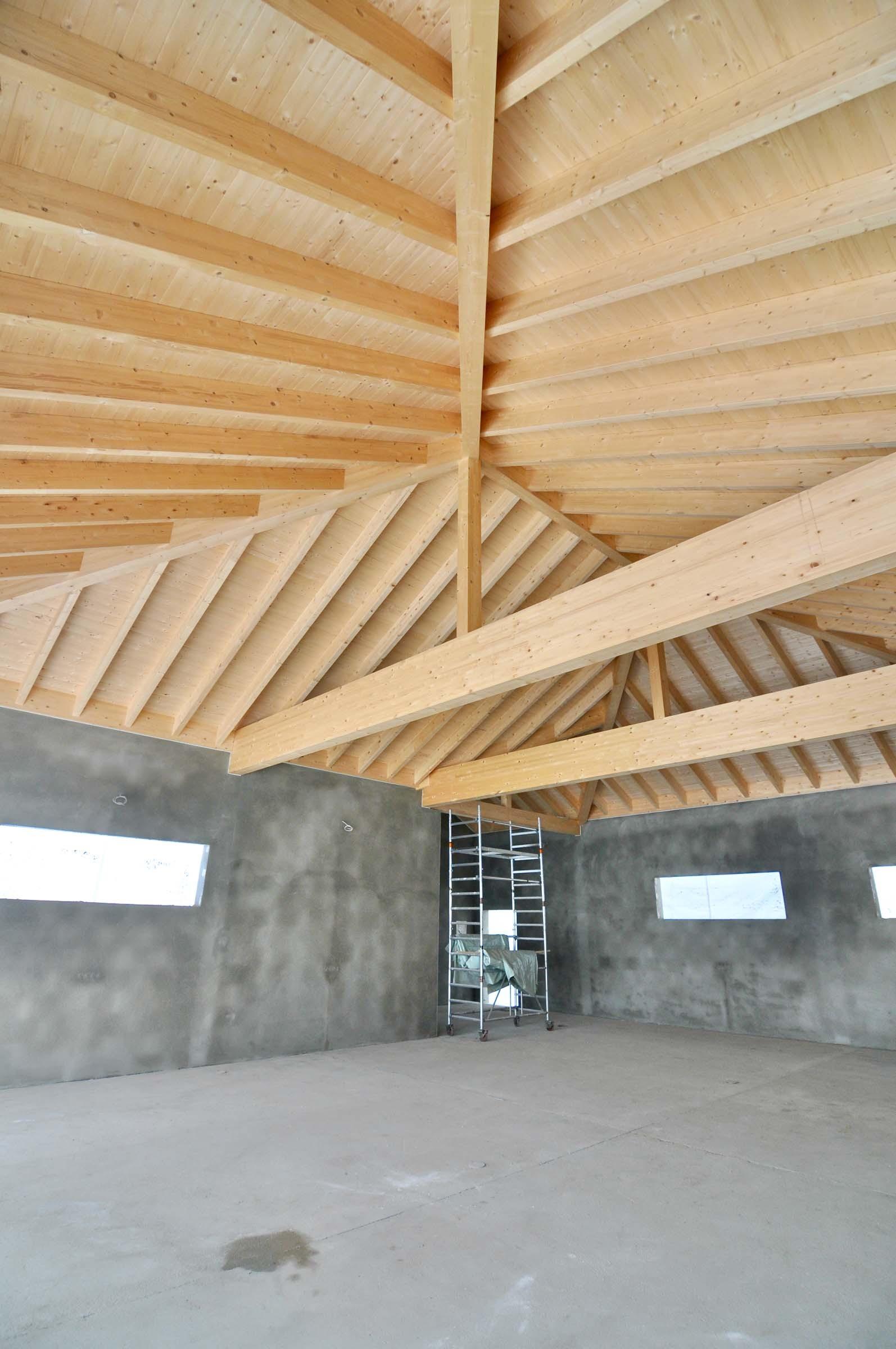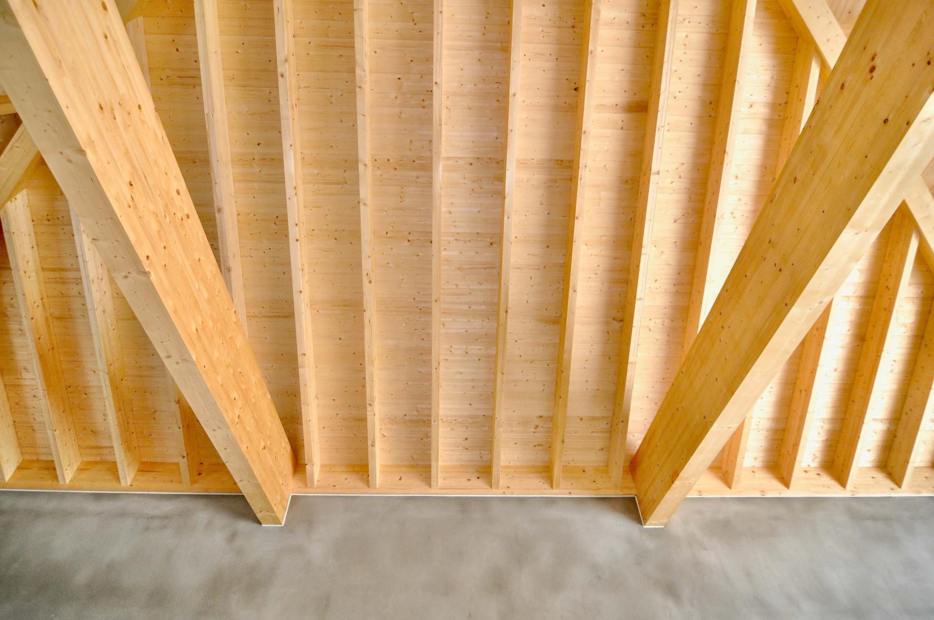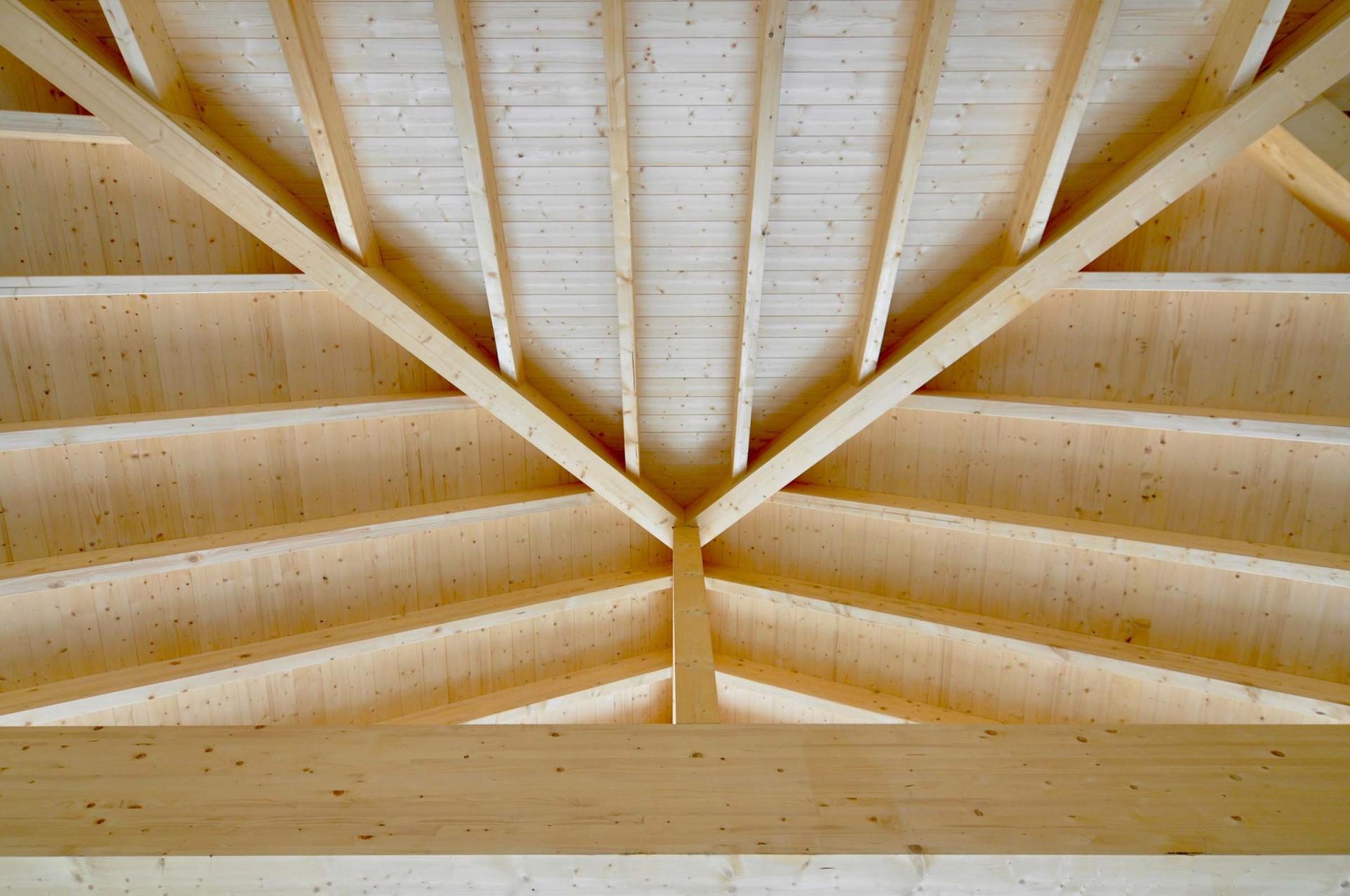 Umsetzung eines Sichtdachstuhls aus Brettschichtholz mit unsichtbaren Verbindungen und maßgefertigter Verkleidung.