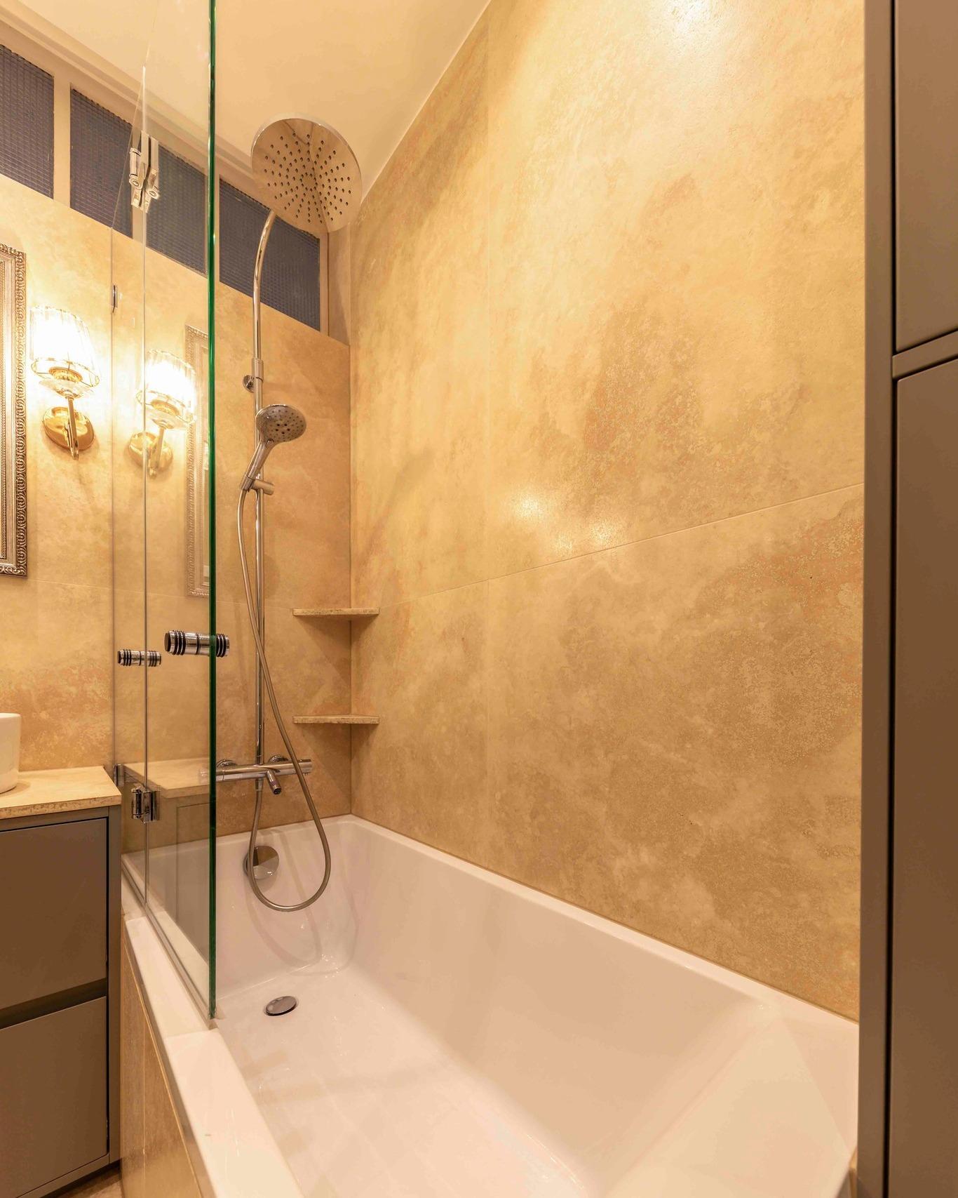 Habillage complet en Travertino Romano Classico Light pour une ambiance claire et épurée